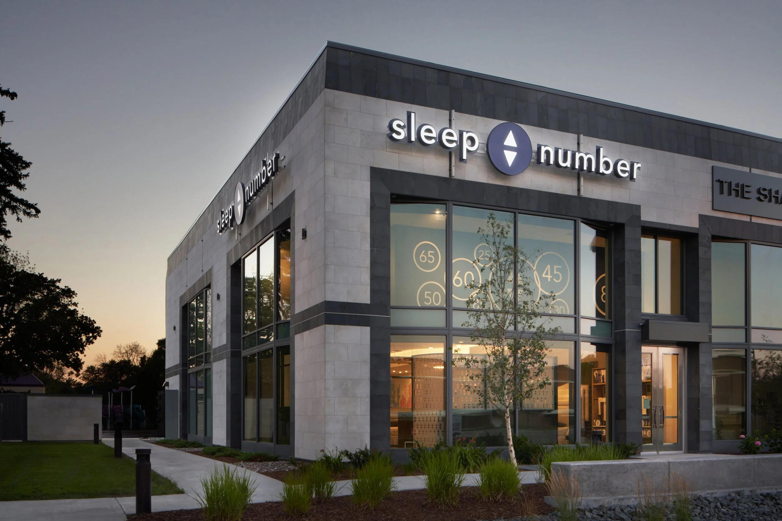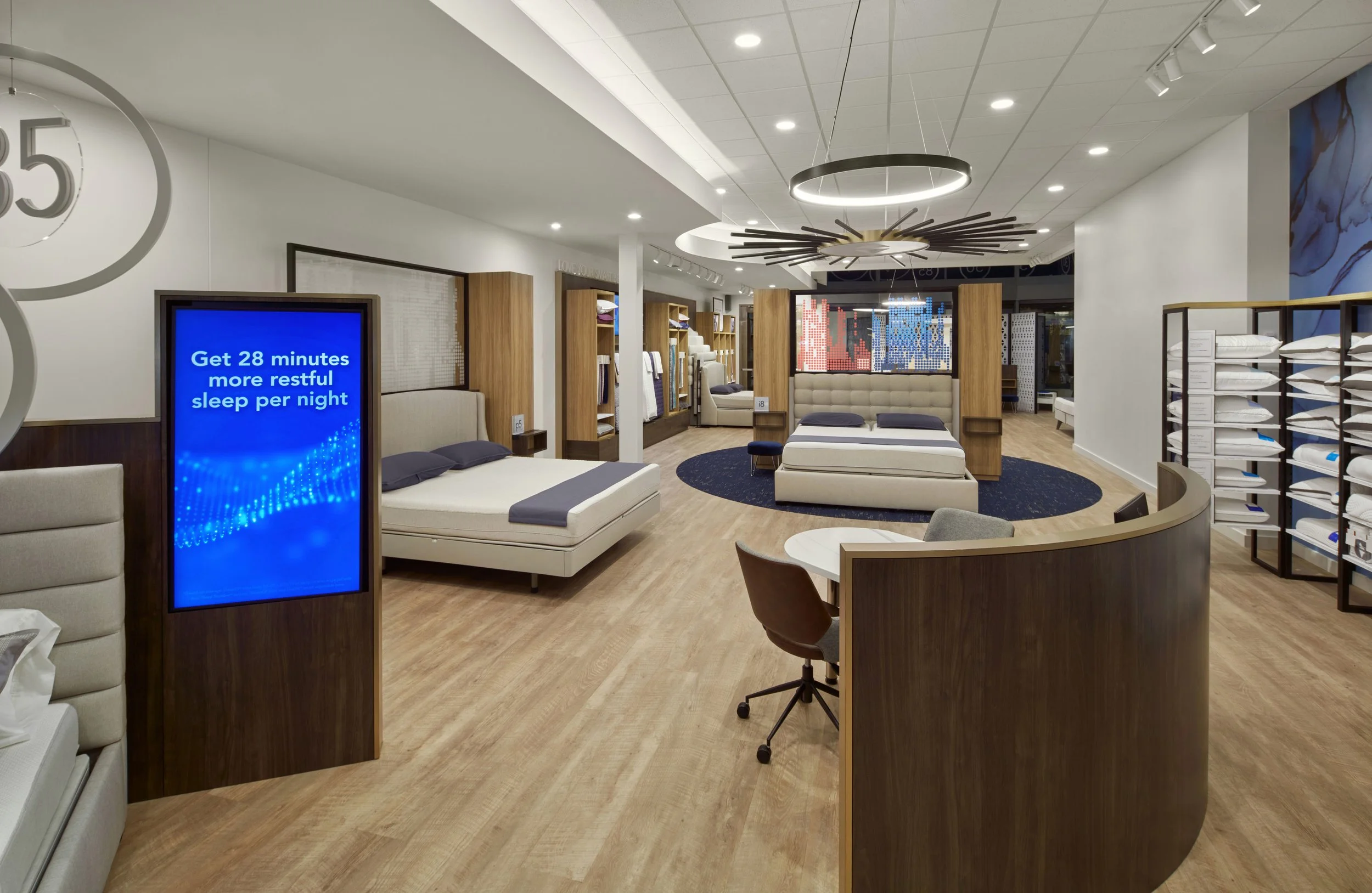 A new Sleep Number store concept features a clean, warm design with minimal signage, utilizing brand imagery and graphic elements.